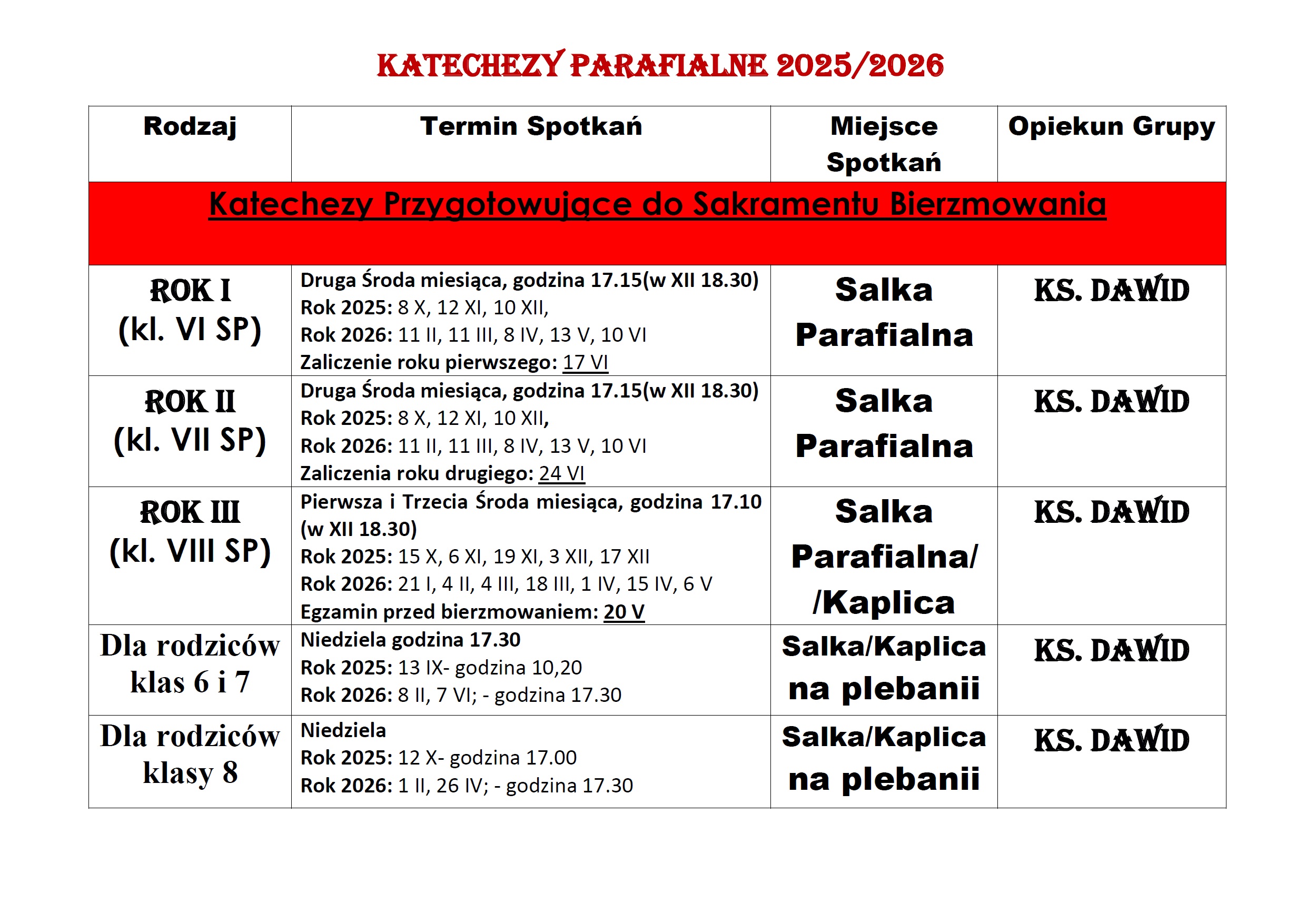 Spotkania przygotowujących się do Sakramentu Bierzmowania z reguły odbywają się w piątki każdego miesiąca z wyjątkiem wakacji o godz. 17.00 lub 17.30
