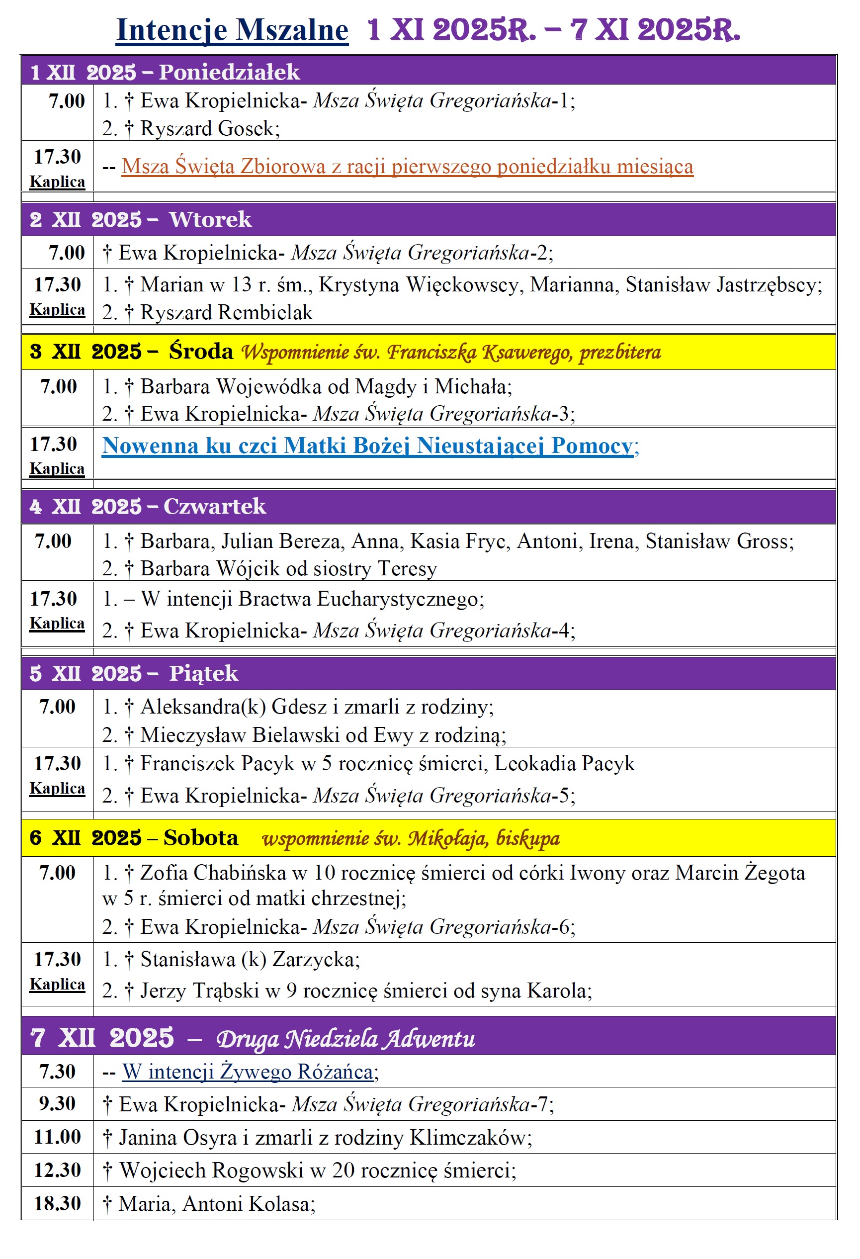 Intencje mszalne w Parafii św. Jakuba Apostoła w Częstochowie w dniach 01.12 – 07.12.2025r.