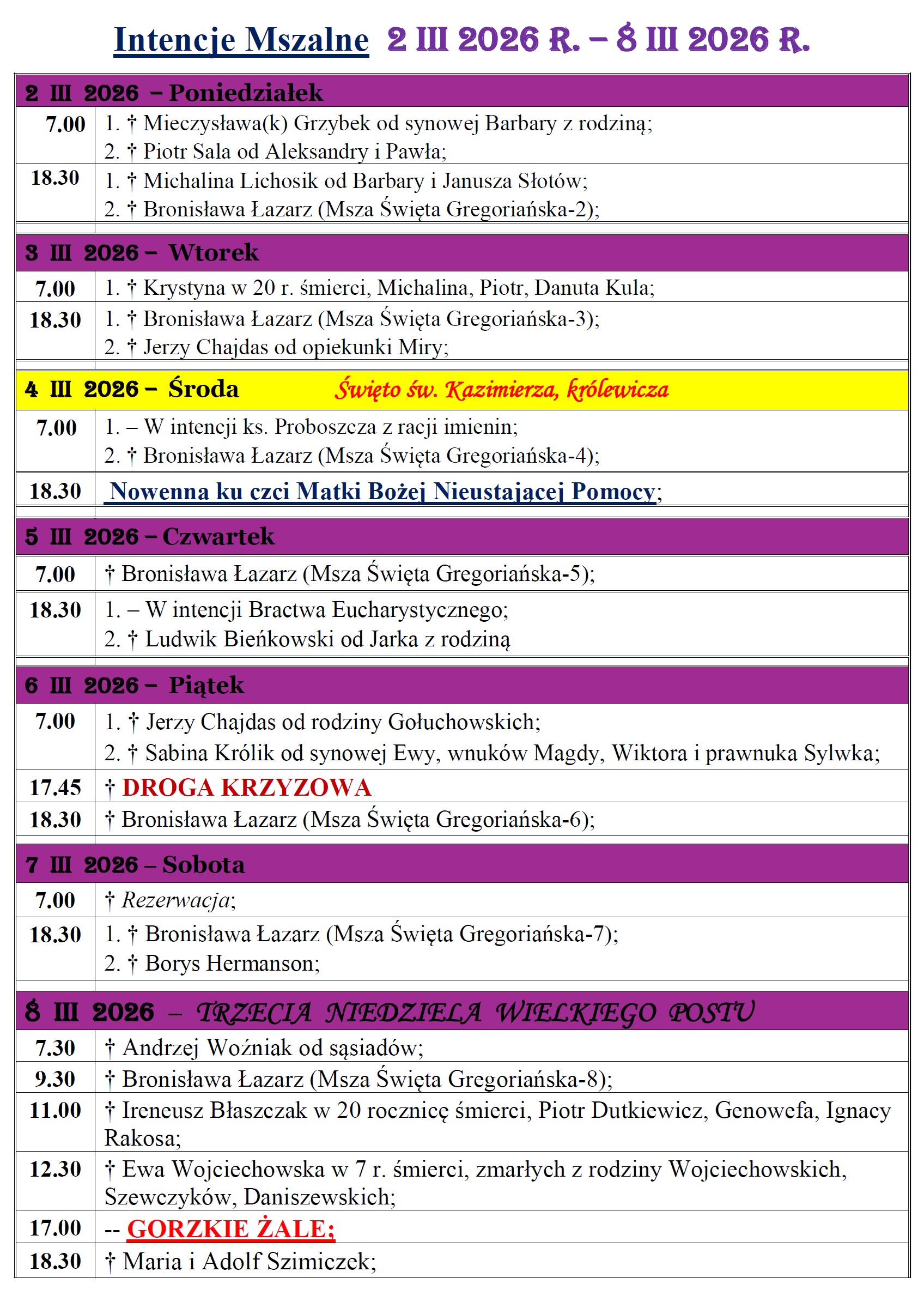 2 mar 2026 Intencje mszalne w Parafii św. Jakuba Apostoła w Częstochowie w dniach 02.03 – 08.03.2026r. przez Duszpasterz | wpis w: Intencje mszalne | 0