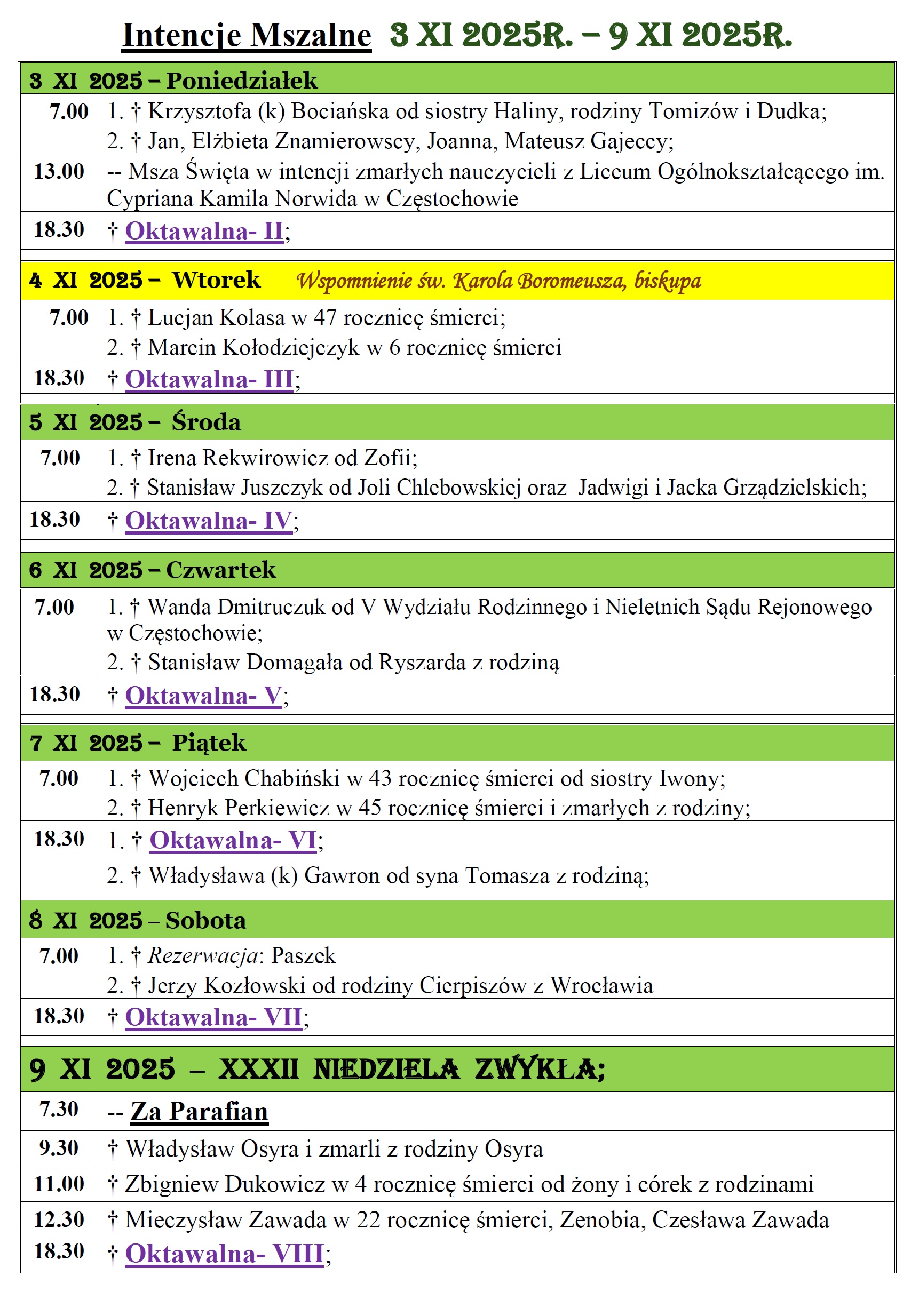 4 lis 2025 Intencje mszalne w Parafii św. Jakuba Apostoła w Częstochowie w dniach 03.11 – 09.11.2025r. przez Duszpasterz | wpis w: Intencje mszalne | 0