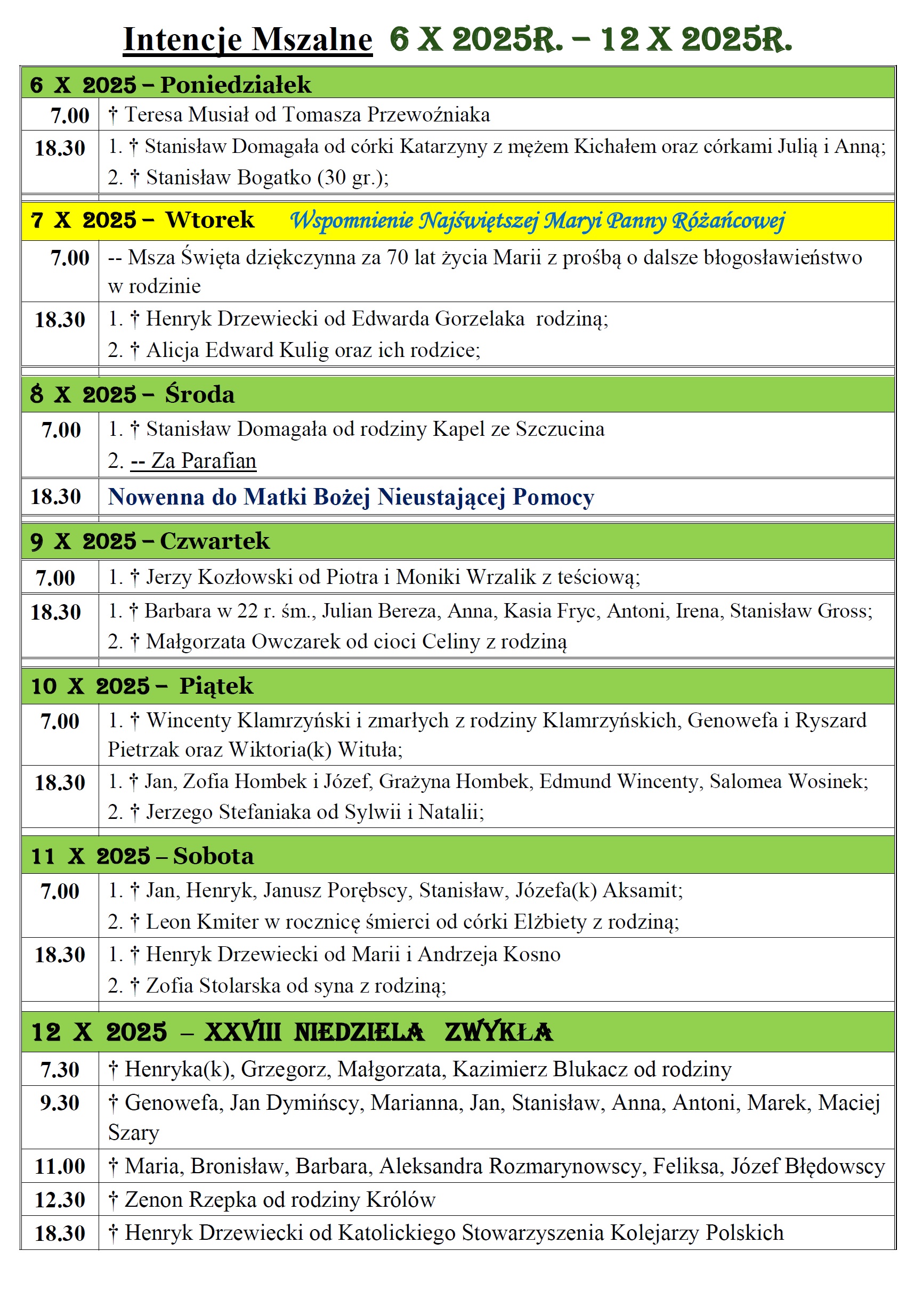 7 paź 2025 Intencje mszalne w Parafii św. Jakuba Apostoła w Częstochowie w dniach 06.10 – 12.10.2025r. przez Duszpasterz | wpis w: Intencje mszalne | 0