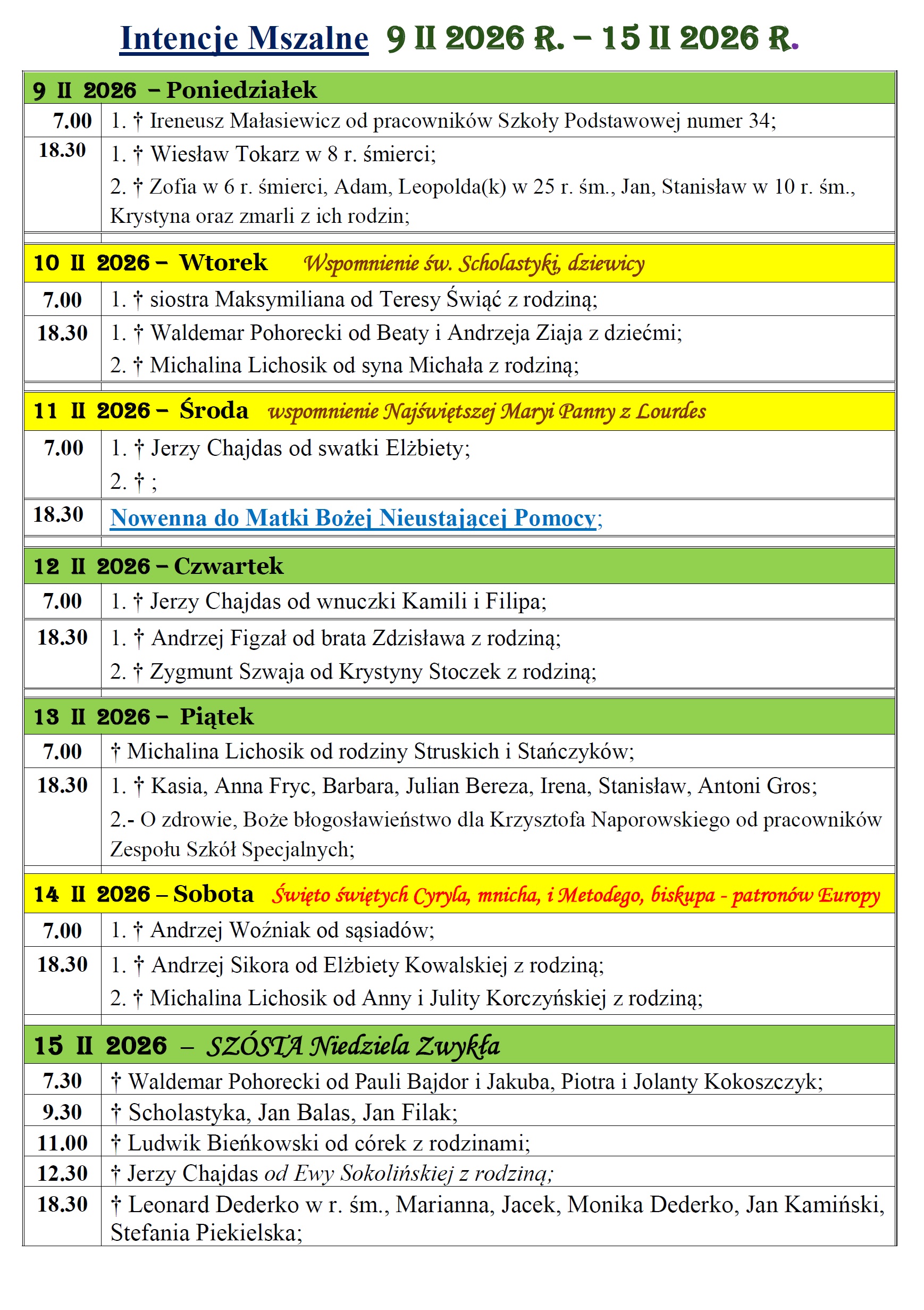 Intencje mszalne w Parafii św. Jakuba Apostoła w Częstochowie w dniach 09.02 – 15.02.2026r.