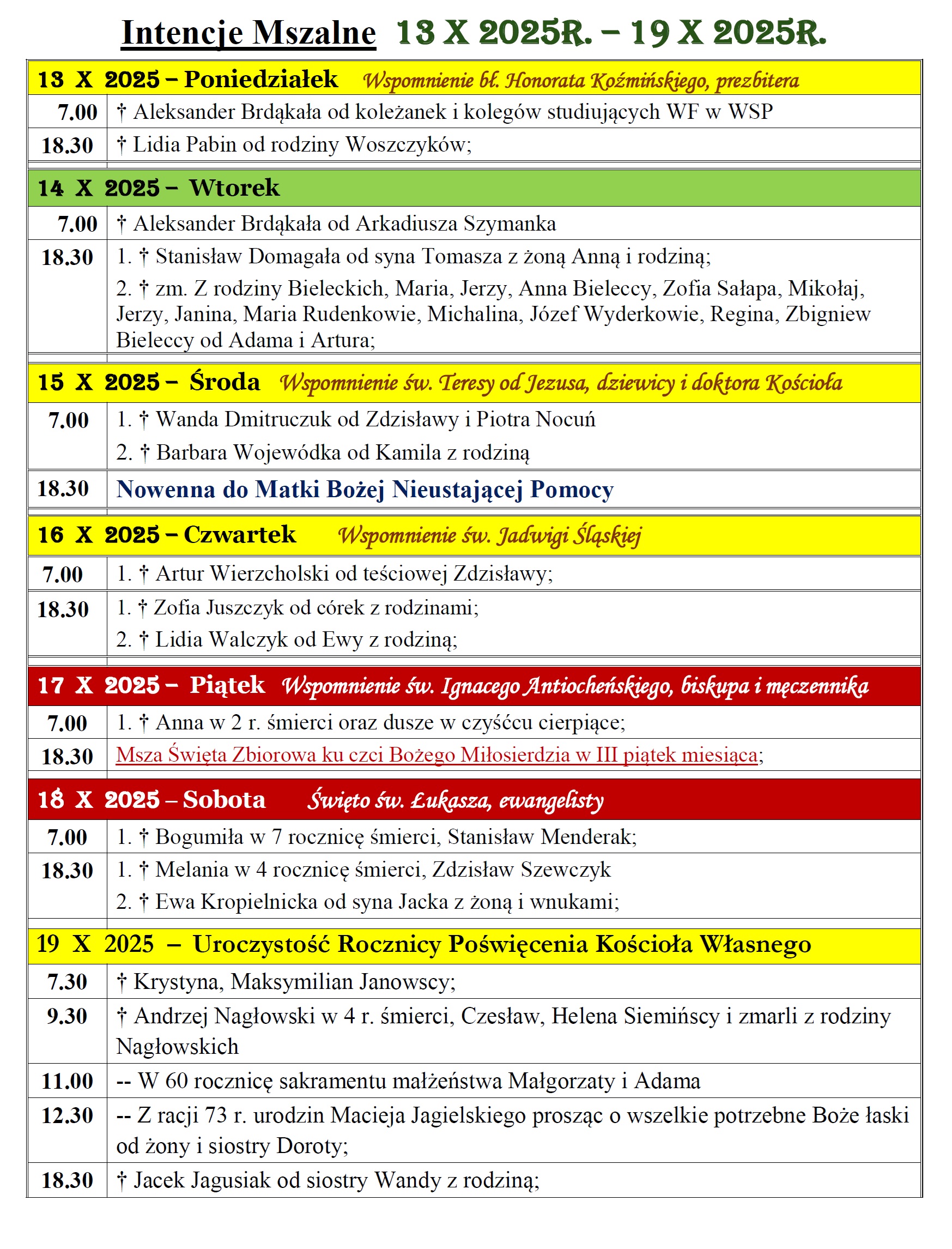 Intencje mszalne w Parafii św. Jakuba Apostoła w Częstochowie w dniach 13.10 – 19.10.2025r.