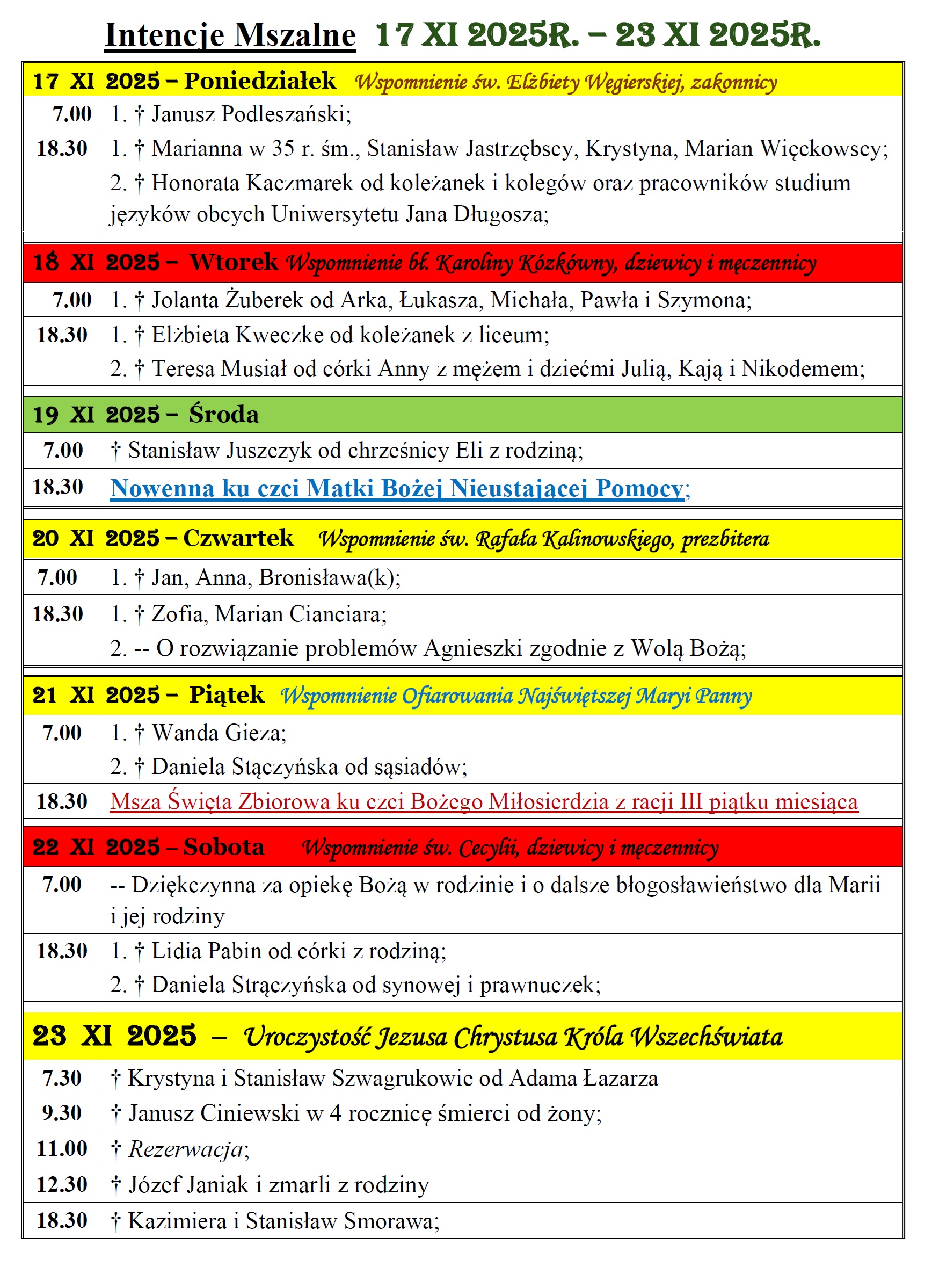 Intencje mszalne w Parafii św. Jakuba Apostoła w Częstochowie w dniach 17.11 – 23.11.2025r.