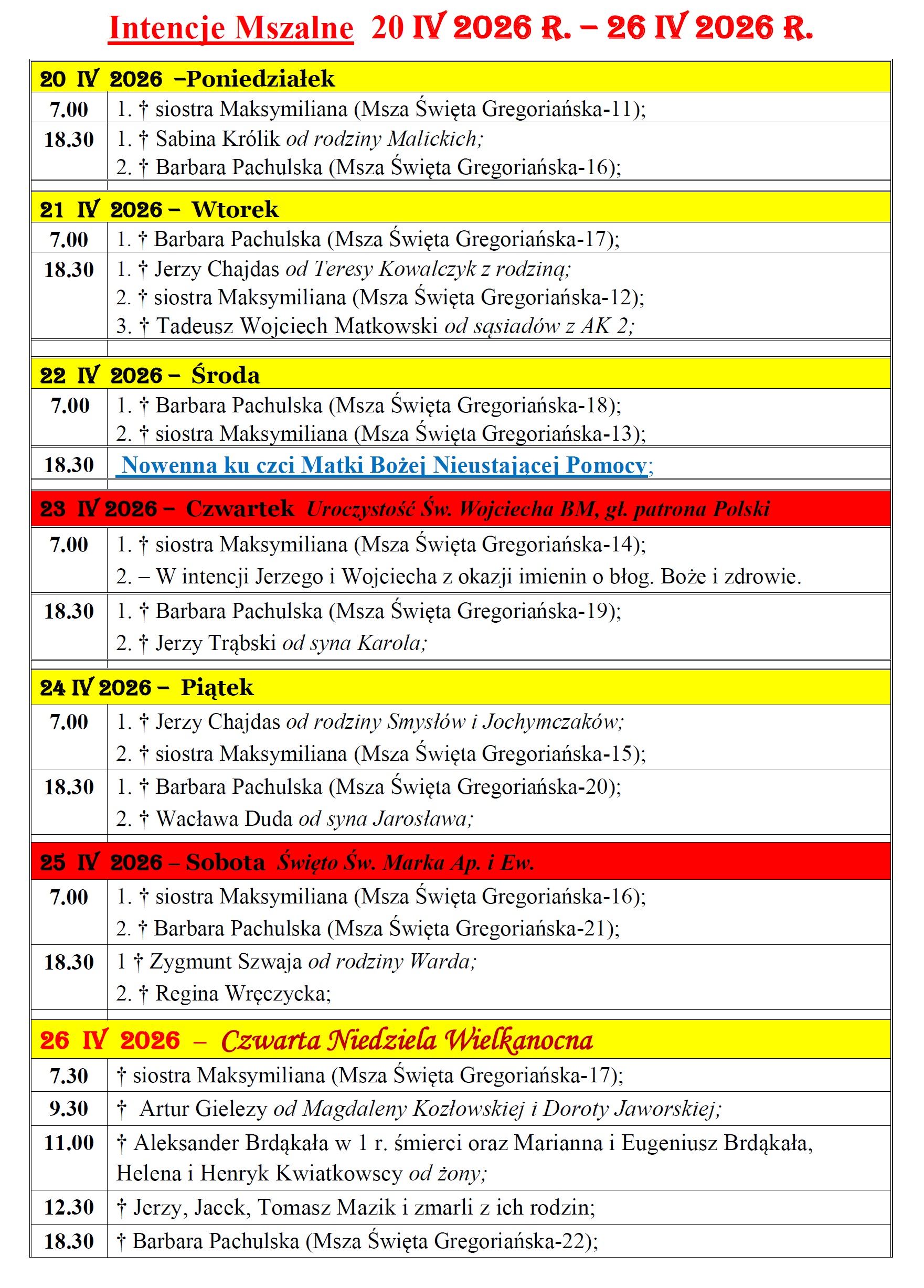 20 kwi 2026 Intencje mszalne w Parafii św. Jakuba Apostoła w Częstochowie w dniach 20.04 – 26.04.2026r. przez Duszpasterz | wpis w: Intencje mszalne | 0