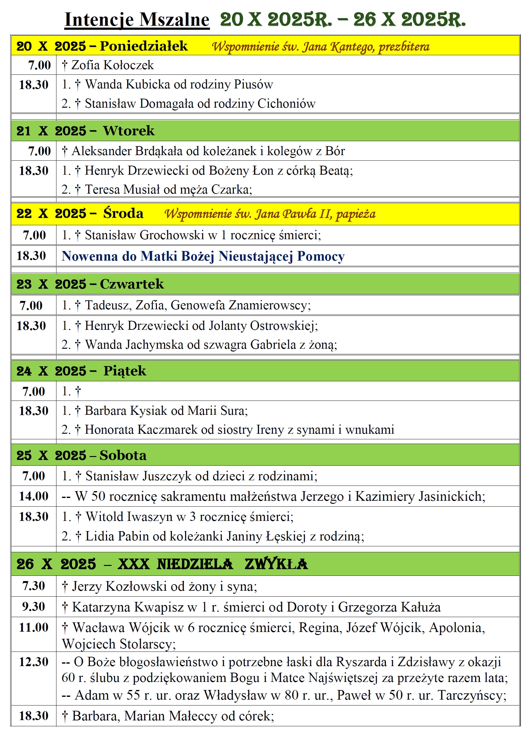 20 paź 2025 Intencje mszalne w Parafii św. Jakuba Apostoła w Częstochowie w dniach 20.10 – 26.10.2025r. przez Duszpasterz | wpis w: Intencje mszalne | 0