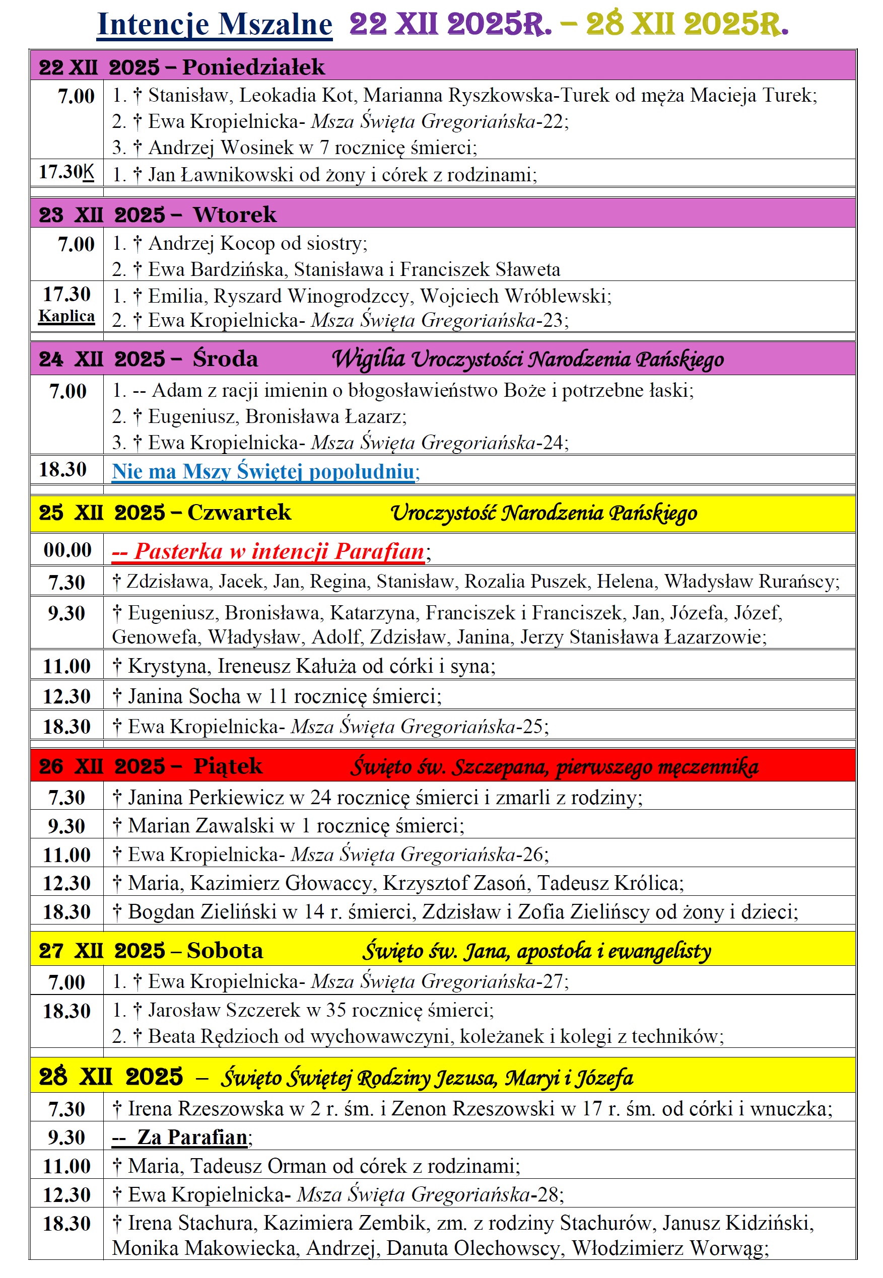 21 gru 2025 Intencje mszalne w Parafii św. Jakuba Apostoła w Częstochowie w dniach 22.12 – 28.12.2025r. przez Duszpasterz | wpis w: Intencje mszalne | 0