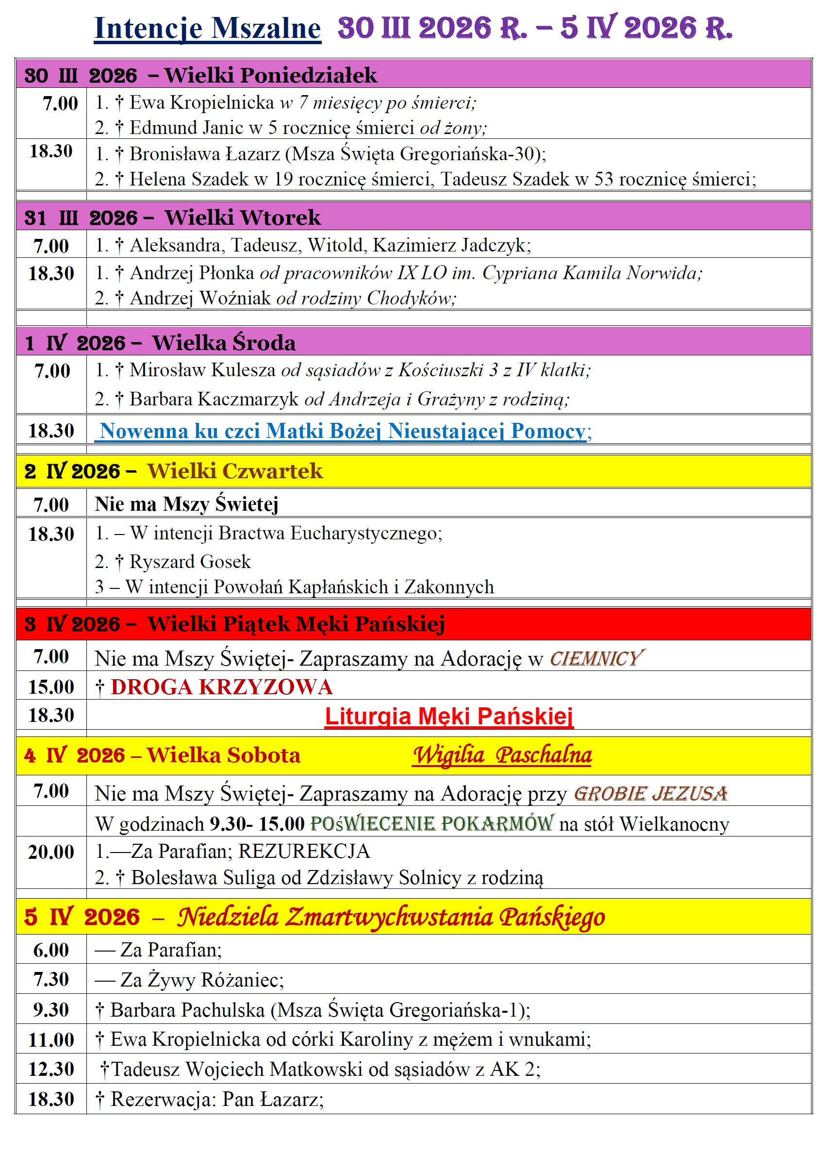 30 mar 2026 Intencje mszalne w Parafii św. Jakuba Apostoła w Częstochowie w dniach 30.03 – 05.04.2026r. przez Duszpasterz | wpis w: Intencje mszalne | 0