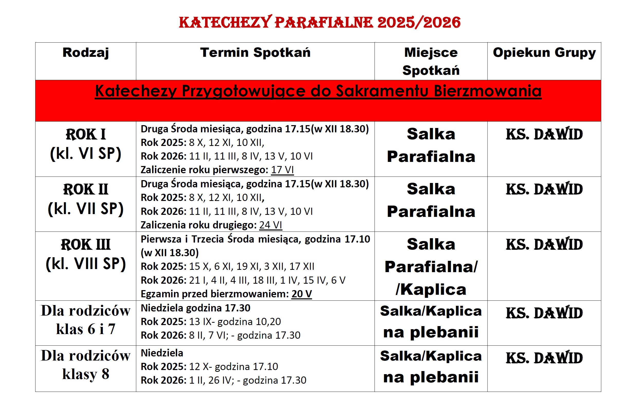 Spotkania przygotowujących się do Sakramentu Bierzmowania z reguły odbywają się w piątki każdego miesiąca z wyjątkiem wakacji o godz. 17.00 lub 17.30